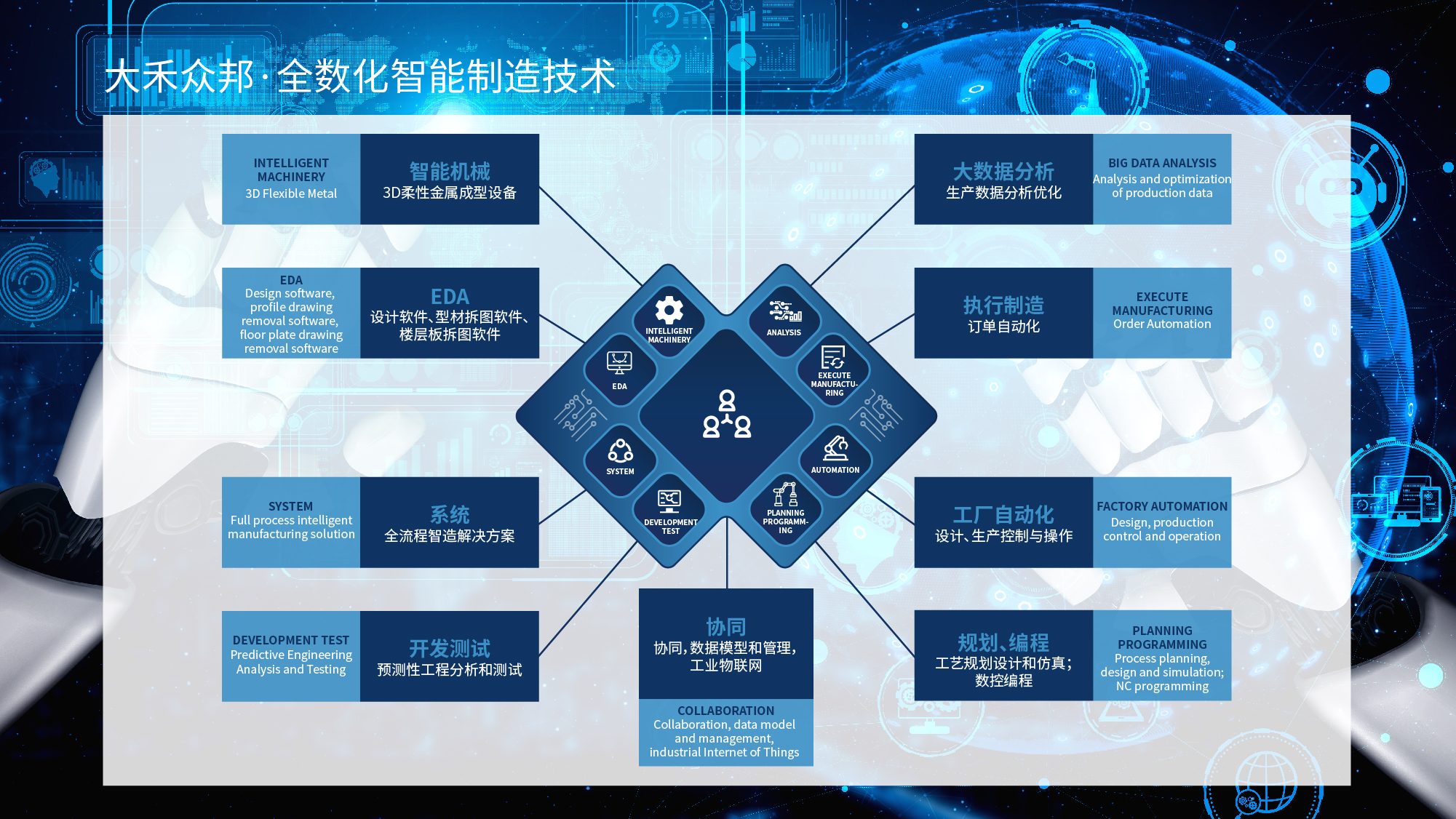 大禾眾邦立業(yè)以來一直深耕鋼結(jié)構(gòu)生產(chǎn)智造領(lǐng)域,不斷的創(chuàng)新研發(fā),測試實驗與生產(chǎn)制造升級。目前,大禾眾邦創(chuàng)新研發(fā)的智能制造整體解決方案,把數(shù)智化軟件與柔性制造技術(shù)融合,借助工業(yè)互聯(lián)網(wǎng)搭建數(shù)智化工廠,以柔性智造實現(xiàn)數(shù)字化設(shè)計、智能化生產(chǎn)、數(shù)字化管理一系列功能,服務(wù)裝配式輕鋼房屋工廠、圍護材料加工廠、光伏支架工廠、模塊化建筑工廠、機器人產(chǎn)線鋼構(gòu)件工廠、汽車行業(yè)等多個領(lǐng)域,已為全球72個國家、3000多個企業(yè)定制開發(fā)出多種創(chuàng)新及實用的生產(chǎn)線,廣受客戶好評。